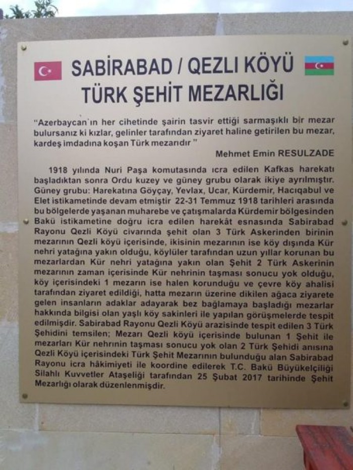 1918-ci ilin mart-avqust tarixləri arasında yaratdığı şərq orduları qrupuna daxil olan Hərbi birliklər, Hərbi nazir Ənvər Paşanın əmri ilə yaradılıb və tamamilə müsəlmanlardan ibarət idi. Qafqaz İslam Ordusu Nuru Paşanın komandanlığı altında 12-14 min Osmanlı əsgərindən ibarət olaraq yola çıxdı. Bu orduya Azərbaycan türklərindən və Dağıstan müsəlmanlarından ibarət könüllülərin qatılması ilə təqribən 20 min olmuşdur. Bolşevik-daşnak qüvvələrinin hücumlarının genişlənməsinə yol verməmək üçün 5-ci Qafqaz Diviziyasının 13-cü piyada alayı Kürdəmir ətrafına yönəldilər. Qafqaz hərəkatı başlanandan sonra Nuru Paşa ordunu quzey və güney qruplarına böldü. Güney qrupu öz istiqamətini Göyçay, Yevlax, Ucar, Kürdəmir, Hacıqabul və Ələt istiqamətində davam etmişdir. 22-31 iyul 1918-ci il tarixləri arasında bu ərazilərdə yaşanan müharibə və döyüşlərdə Kürdəmir bölgəsindən Bakı istiqamətinə doğru  icra edilən hərəkat əsasında Sabirabad rayon Qəzli kəndi ətrafında Şəhid olan 3 türk əsgərinin cəsədlərindən ikisi yerli sakinlərin yardımı ilə Qəzli kəndinin içərisindən keçən Kür çayının sol sahilində dəfn edildi. Digər yaralı əsgəri kəndə gətirdilər. Lakin Rus-Erməni Bolşevik qüvvələri bundan xəbər tuturlar. Kəndə girərək yaralı türk əsgərini silah gücünə sakinlərin əlindən alaraq özləri ilə aparırlar. Türk əsgərin silahı çox qızdığından yararsız idi. Bolşevik Rus-Erməni qüvvələri yaralı əsgəri amansızcasına qətlə yetirdilər. Cəsədi yerli sakinlərə vermək istəmirdilər. Türk olan yerli əhali ağsaqqalları ilə və kənd sakinləri topladıqları qızılla türk əsgərinin  cəsədini onlardan geri alaraq kəndin mərkəzində dəfn edirlər.