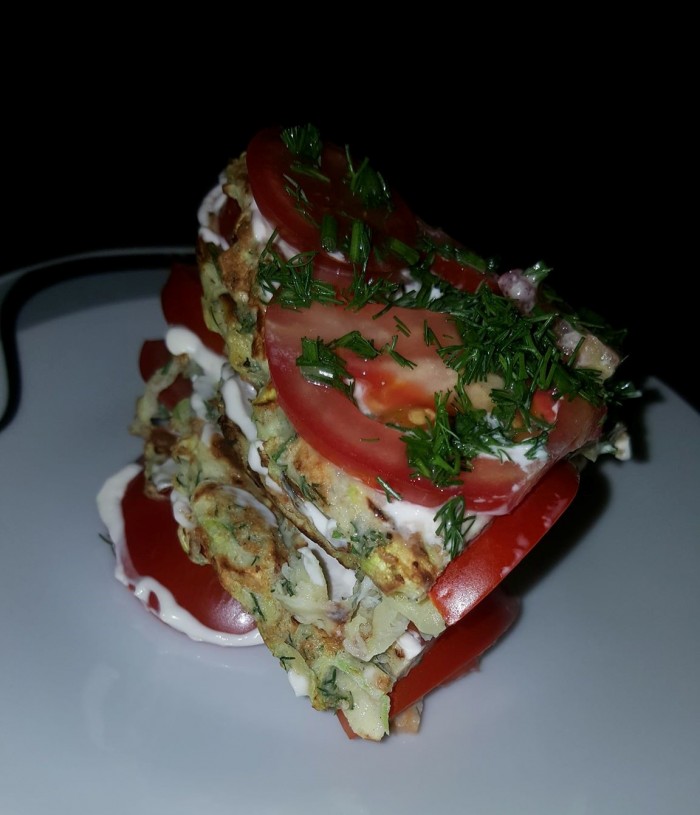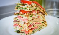 Əvvəlcə kabakları sürtgəcdən keçirib suyunu buraxması üçün 1 - 2 çay qaşığı duz əlavə edirik və gözləyirik ki, suyunu buraxsın. Suyunu buraxdıqdan sonra kabakların suyunu yaxşıca sıxırıq. Sonra üzərinə yumurta, un, doğranmış şüyüd əlavə edib qarışdırırıq. Sonra tavaya duru yağ tokub qızdırırıq. Hazırladığımız qarışıqdan qaşıqla tavaya töküb kreplər bişiririk. Kreplərin hər iki üzünü qızardırıq. Kreplər soyuduqdan sonŕa düz boşqaba 1 qat krep qoyub üzərinə mayonez çəkirik, onun da üzərinə halqa şəklində doğranmış pomidor düzürük və prosesi təkrar edirik. Sonda üzərini zövqə görə şüyüdlə bəzəyirik.