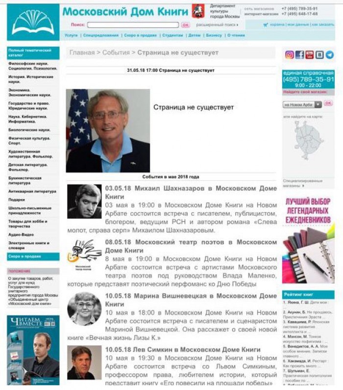 Mayın 31-də Yeni Arbat küçəsində yerləşən Moskva Kitab Evində (“Dom Kniqi Moskvı”) keçirilməsi planlaşdırılan təqdimat səbəb göstərilmədən ləğv olunub. Kitab Evinin nümayəndəsi bunun səbəbini açıqlamayıb.